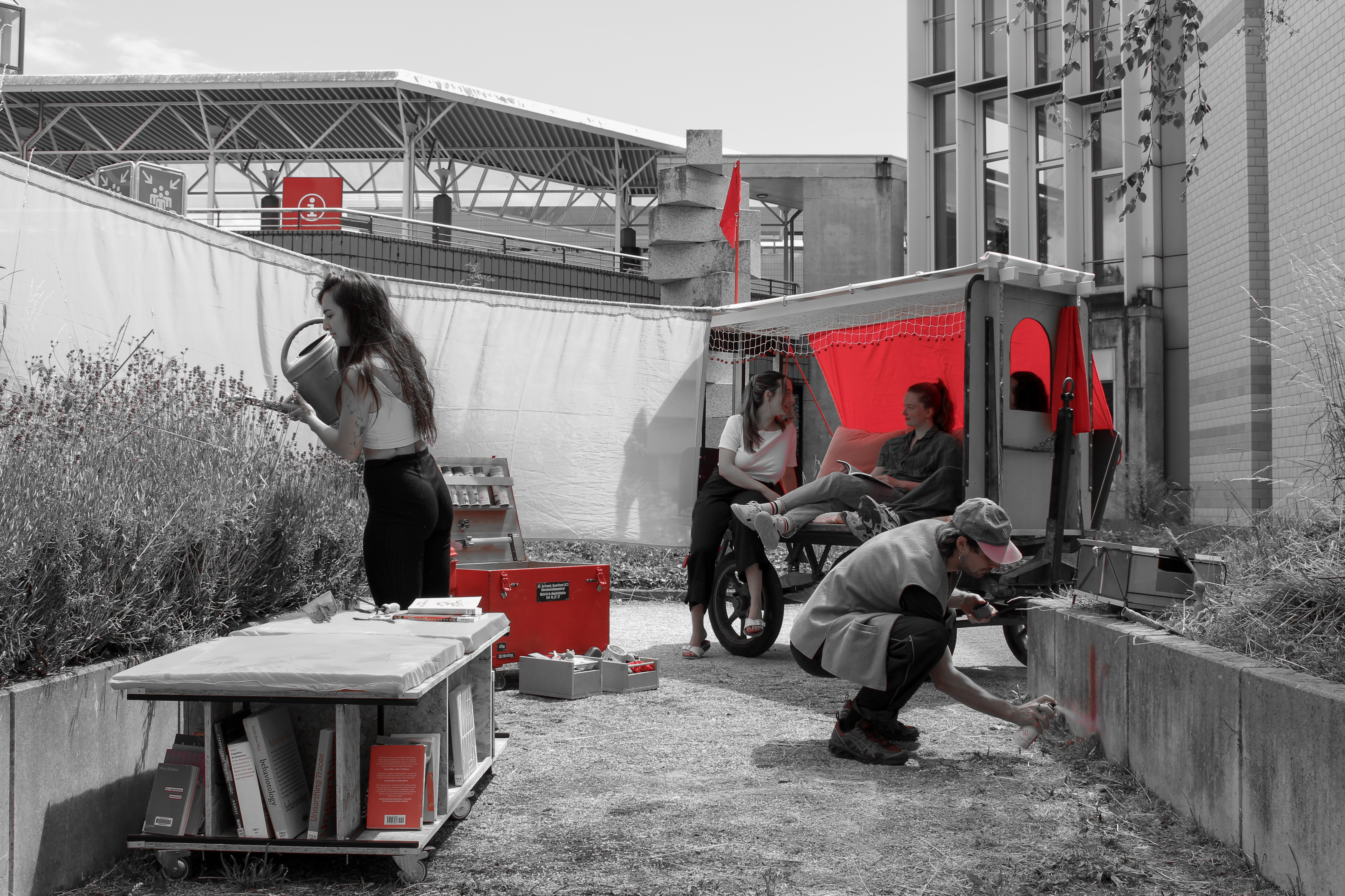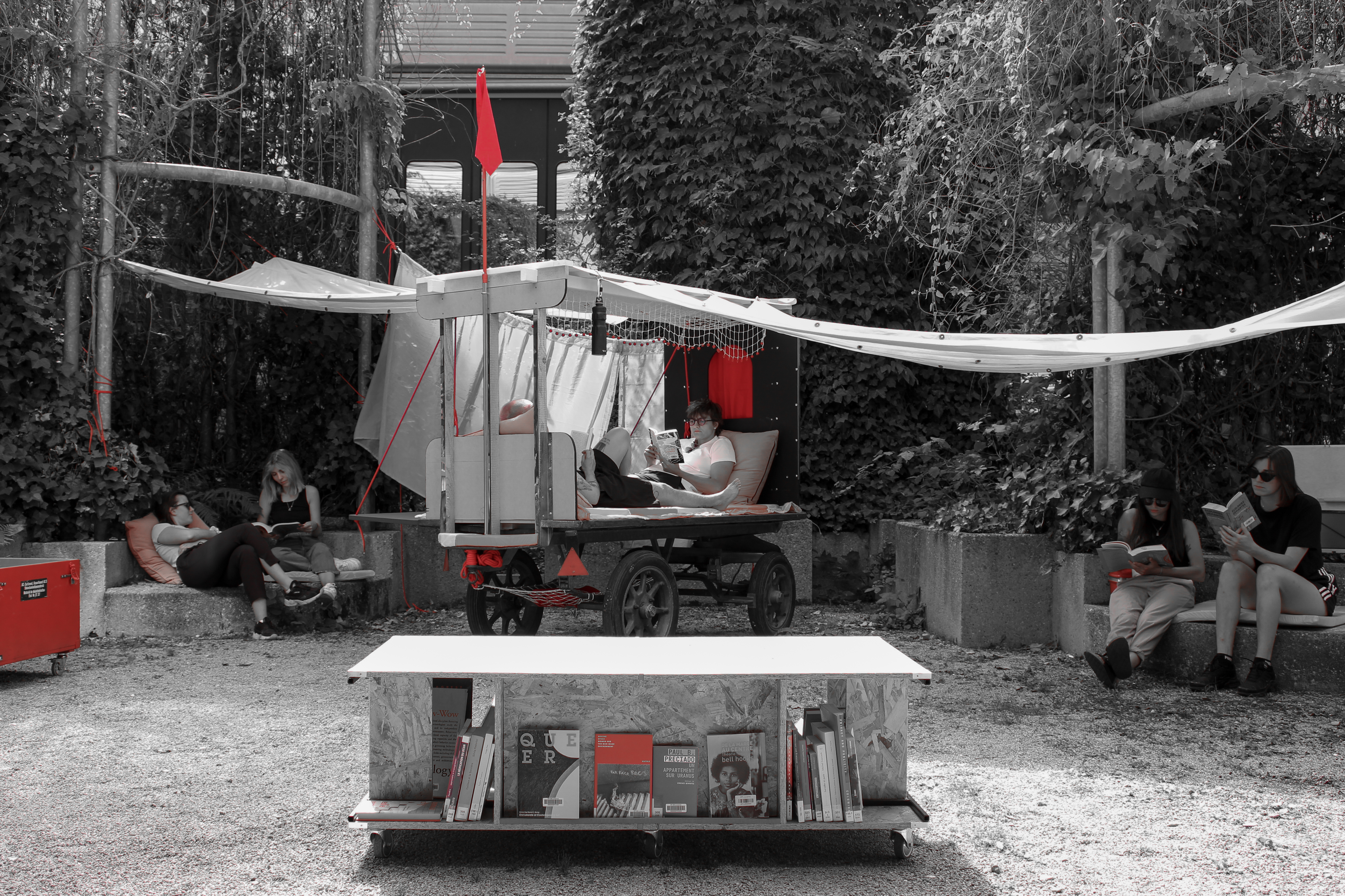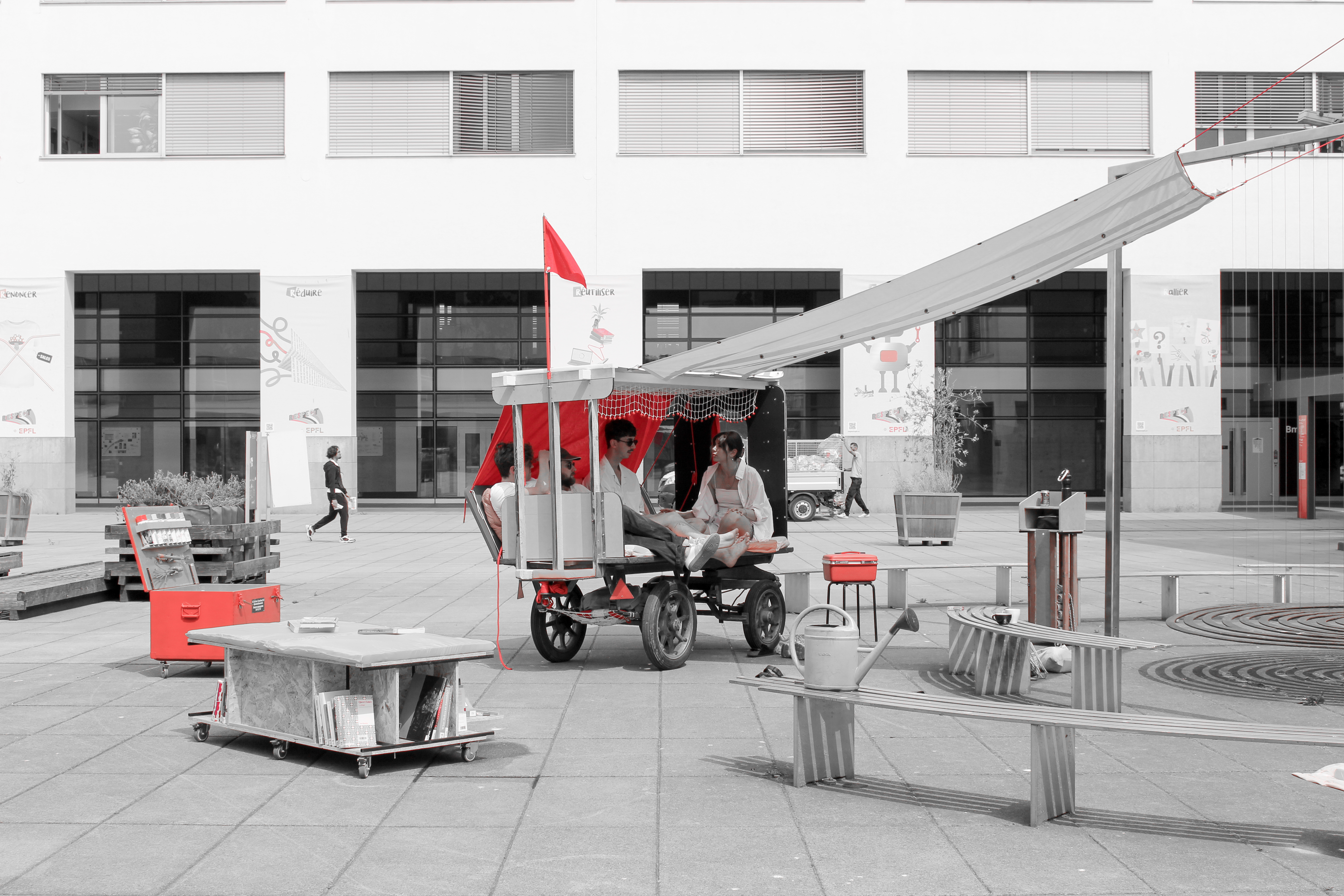 Le Théâtre de la Dissidence est un projet évolutif visant à offrir une structure itinérante et appropriable aux associations et au corps étudiant de l’EPFL. Dans la continuité des énoncés Poétique des siestes résistantes. Construction d’un espace commun de rêve et de lutte et Queering public space. (Dé)construire la façade, le projet est un dispositif d’infiltration subversive de notre institution par la création spontanée d’espaces de rassemblement autour de la pratique du soin radical : repos, jardinage, lecture, jeu, discussion et, surtout, beaucoup d’amour. Pour opérer, le projet dissimule sa vraie nature et sème des indices dans un (en)jeu de in/visibilité. Sa construction est essentiellement basée sur le réemploi de matériaux. La découverte d’une ancienne charrette à bagages CFF a constitué la première pièce de notre puzzle : la colonne vertébrale autour de laquelle nos scénographies s’organisent. Puis, suivant la fonction initiale de la charrette, une série de bagages-modules a été conçue; des protagonistes essentiels à la propagation de nos bulles éphémères de douceur offensive. Notre rituel de déploiement est simple : une fois chargée, la charrette pirate défait ses amarres, parcourt les souterrains rugueux de l’institution et émerge là où on l’attend le moins. Nous occupons alors un espace, prenons soin de lui, de nous-mêmes et des autres, puis, lorsque les circonstances ne le permettent plus, nous le quittons, et nous plongeons à nouveau dans le calme des abysses pour mieux ressurgir ailleurs, encore et encore.