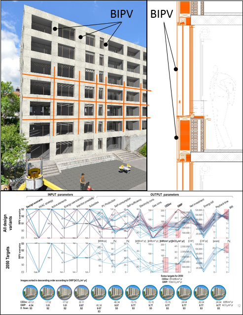 The renovation of existing buildings is one of the priorities of western countries and needs to be promoted to increase the current low renovation rate, estimated to be of 0.6% per year in the European and Swiss contexts. In parallel, the implementation of building‐integrated photovoltaic (BIPV) elements during the renovation process can provide a crucial response to achieve the 2050 targets in terms of greenhouse gas (GHG) emissions and energy savings. In this context, architects, designers and engineers have a key role in achieving these objectives, mainly because they are responsible for the design decisions during the development of the projects, especially during the early‐design phase when the most influential decisions are taken. Through a real‐case study built in 1968, this research shows how certain design‐decisions in renovation processes can affect or compromise the final performance of the building from a global life‐cycle and multi‐criteria approach. Life‐Cycle Analysis (LCA) and Cost (LCC) results show the importance of not losing the opportunity to go beyond current practices when a building needs to be renovated and highlight the necessity to take into consideration BIPV strategies to guarantee both economic and environmental targets.