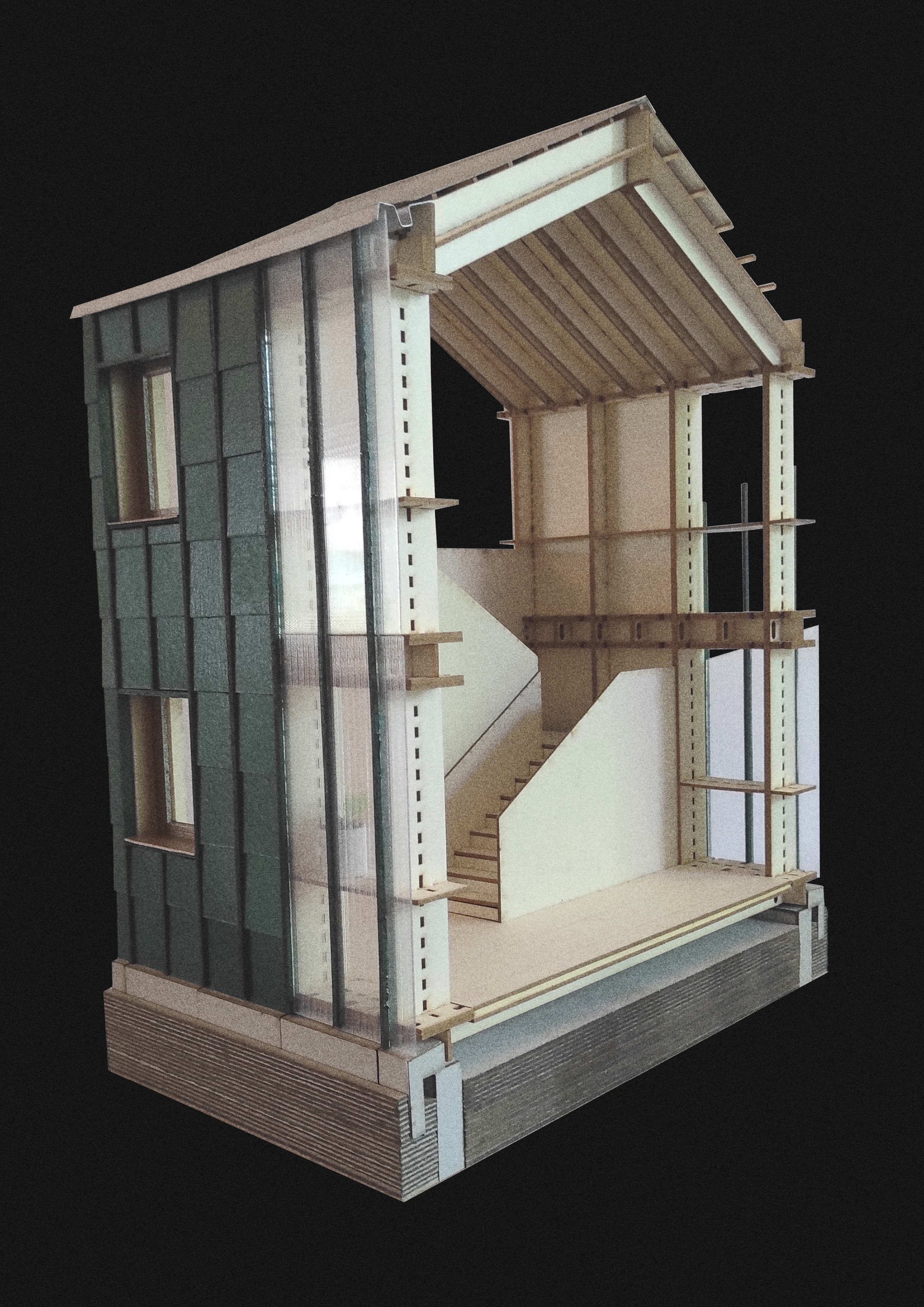 Entre circuits courts, « maker culture » et nouveaux modes d’autoproduction, ce projet propose une « middle-out architecture » à la fois planifiée et ouverte, infrastructurelle et légère, assurant le minimum nécessaire et encourageant la participation des usagers dans son développement. Le projet se situe dans le sud du Pays de Gex, un secteur enclavé et satellitaire du Grand Genève, qui subit la politique du « construire la ville en ville » émanant de la Confédération. Colonisant l’entre-deux qu’est la ceinture verte genevoise qui s’étend au-delà de la ligne ferroviaire réactivée au pied du Jura français, ce projet relève plutôt d’un « droit à la ville » qui entend rééquilibrer une économie locale fortement polarisée reposant sur la mobilité pendulaire, et permettre ainsi à la région de trouver autant son autonomie que sa place dans la métropole lémanique. D’une part, la cohésion est assurée par un système constructif commun et par un ancrage plus permanent, notamment à cette épine dorsale, qui reconnaissent la morphologie linéaire locale. D’autre part, une construction en bois, légère, modulable et agrégative, assistée par ordinateur, permet une libre appropriation, démocratise la conception, la construction et les potentielles reconfigurations, qui deviennent ainsi des processus résolument émergents. La flexibilité et la mixité programmatique qui en découlent visent à court-circuiter les relations travail-habitat, mêlant espaces résidentiels, productifs, d’activité, de loisirs et agriculture urbaine.