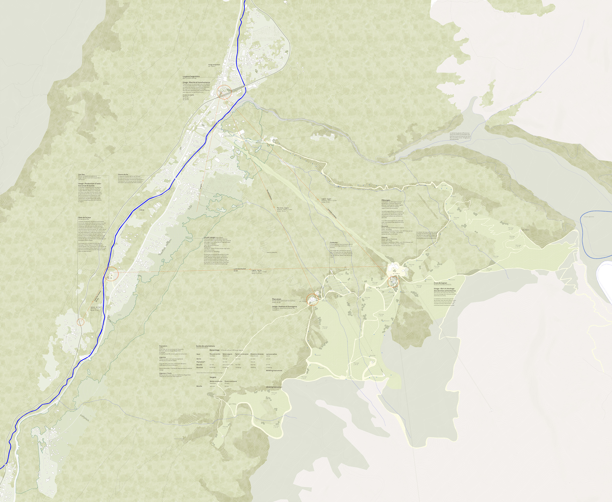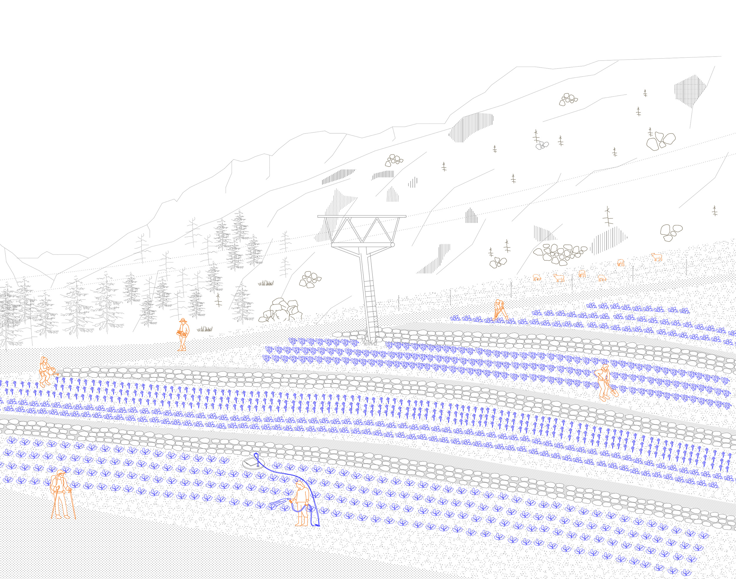 À Chamonix, dans les Alpes du Nord, la forte dépendance au tourisme et les impacts climatiques incitent à repenser le modèle économique de la région. À moyen terme, de nombreux bâtiments et infrastructures deviendront obsolètes en moyenne montagne. Les alpages, eux, continueront de fournir de bonnes conditions de pâturage tout en devenant propices aux cultures. Dans cette optique, le projet vise à s’émanciper de cette dépendance en proposant une alternative et une transition vers un modèle qui privilégie le (re)développement du pastoralisme et de l’agriculture en tandem avec le tourisme et fait le pari d’une activité tournée vers l’avenir. Ainsi, sur les étendues surplombant le village d’Argentière, le projet génère un nouveau paysage qui promeut le pastoralisme tout en introduisant des cultures vivrières. Les interventions ponctuelles et la réhabilitation de différents bâtis permettent d'intégrer les nouvelles activités. La laine de mouton, souvent gaspillée faute de débouchés, est désormais valorisée et transformée en isolants et en fil textile. Les travailleurs et les randonneurs profitent d’un nouvel habitat, une fromagerie soutient l’économie pastorale de la région, et un abri offre refuge aux bêtes. L’ancien réseau de canons à neige procure un nouveau potentiel d’acheminement des eaux vers les différentes cultures et pâturages. Enfin, devant la gare d’Argentière, la nouvelle place accueille un marché de vente des produits.