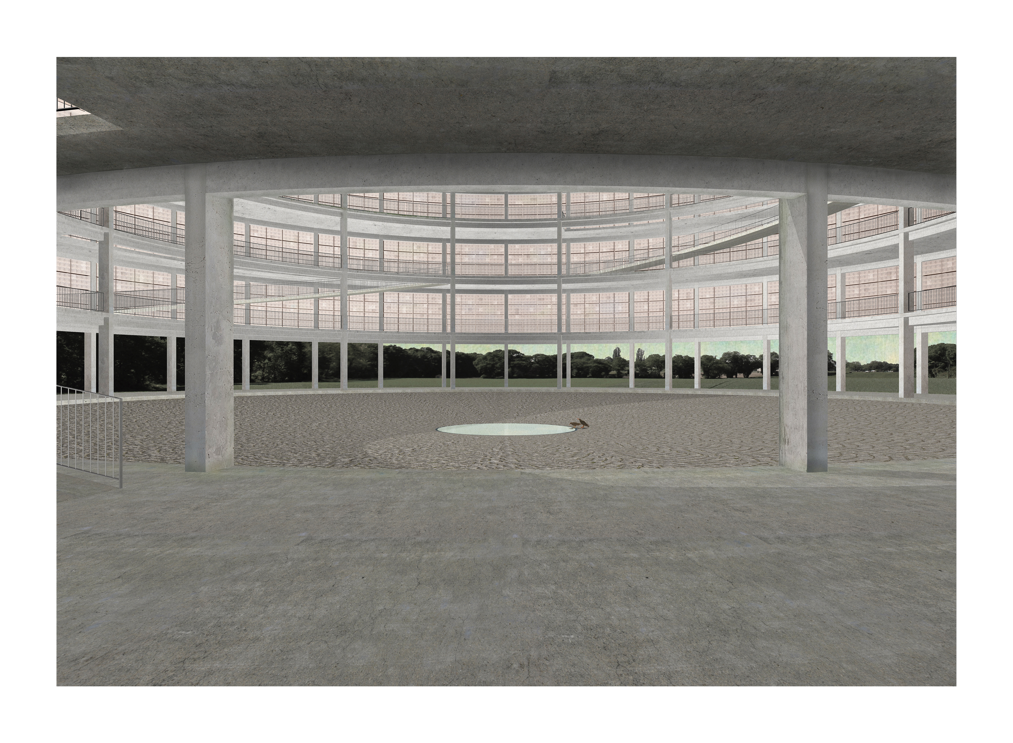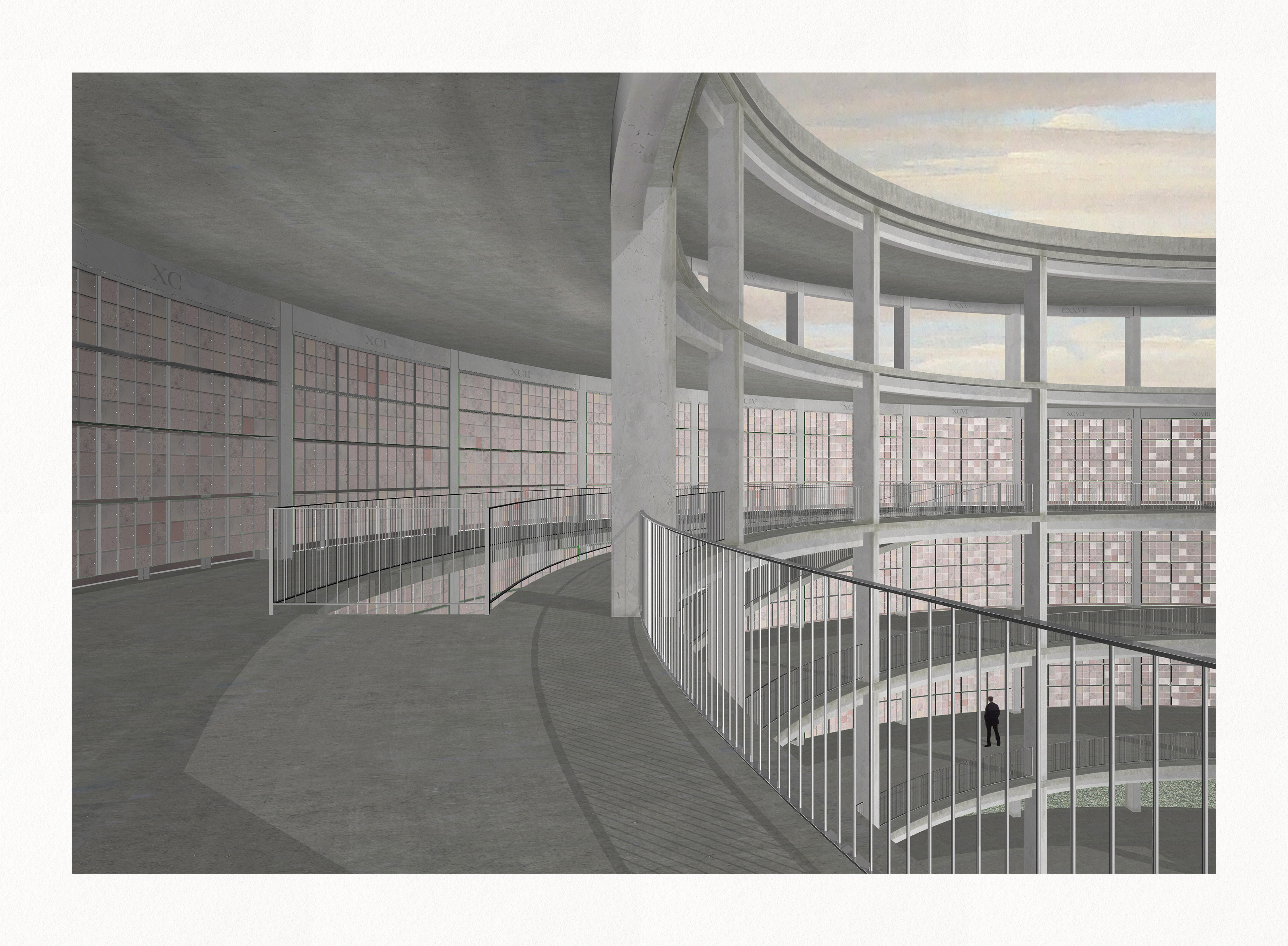 Les formes de la ville ainsi que les nouvelles pratiques funéraires incitent à repenser la construction physique et mentale de l’espace des défunts. Le projet participe ainsi au paysage urbain genevois actuel et représente un cadre collectif contemporain. La proposition est un columbarium à l’échelle de la ville de Genève: un lieu de mémoire, établissant des relations avec son environnement proche et lointain, capable d’accueillir les urnes des défunts et de permettre le déploiement des rites funéraires. Le projet se place dans un des coudes du Rhône, une portion de territoire encore rurale et boisée côtoyant l’intensité urbaine. Le bâtiment principal y crée sa propre logique, celle de la forme pure et autonome du cercle. En s’élevant au-dessus de la canopée, l’édifice silencieux et intemporel fait comprendre son statut de signe dans le paysage sublime. Le bâtiment est conçu comme une structure élémentaire vide en béton armé – telle une ruine circulaire borgésienne – qui se complèterait, niveau par niveau, au fil du temps. Seul le rez-de-chaussée de l’édifice reste libre d’urnes, un seuil entre la nature qui l’entoure et son intérieur. Ainsi le paysage et le monument se complètent dans leur construction architecturale. Finalement, l’individu découvrant le cœur du bâtiment arrive dans un espace solennel, une atmosphère chargée par la mémoire des défunts qui l’entourent.