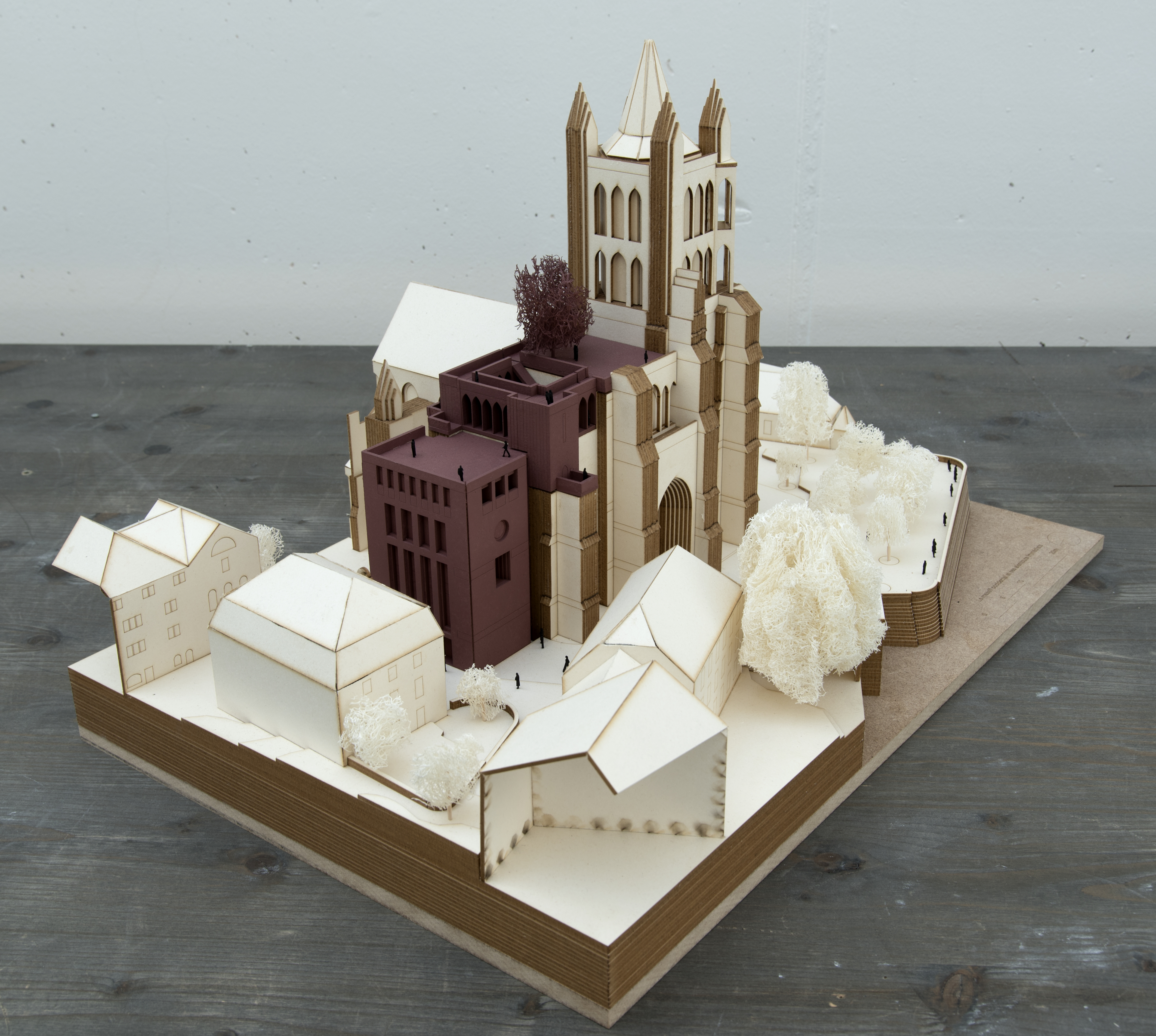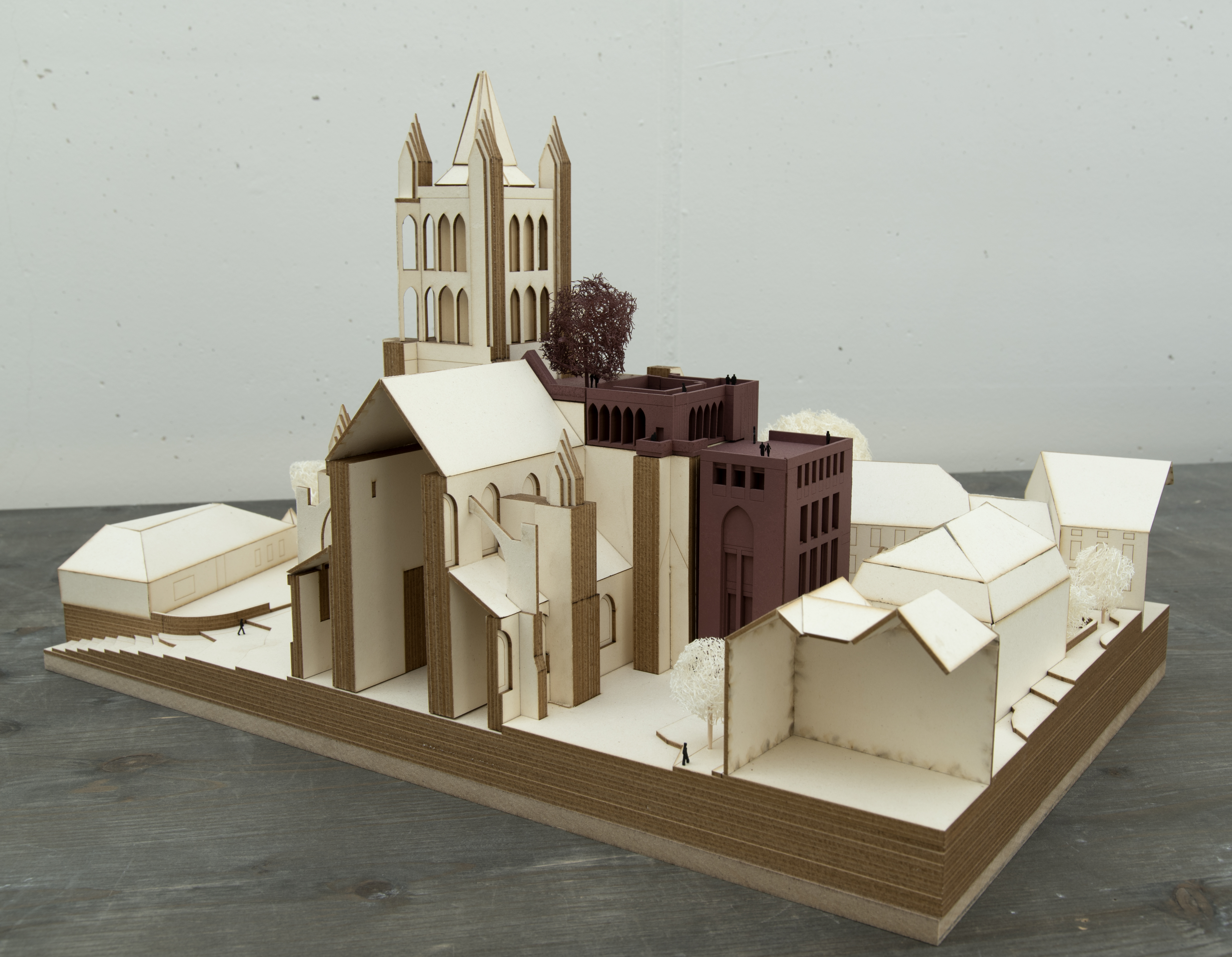 La plupart des monuments d’Europe sont aujourd’hui placés hors du temps comme témoins historiques à forte attraction touristique. Conservés et restaurés dans une forme figée, ils répondent peu aux besoins de la société. Il est temps que celle-ci réinvestisse ses monuments, les habite quotidiennement à nouveau et leur apporte, si nécessaire, de nouvelles valeurs ajoutées tout en respectant leur intégrité. La cathédrale de Lausanne, bien qu’élément phare de la ville, est délaissée par les habitants. Ce projet utilise le massif occidental de l’église, historiquement détaché de toute fonction religieuse, et le convertit en maison de quartier pour la population de la Cité. Caractéristique identitaire de la cathédrale, l’élévation en paliers de la façade occidentale culmine dans l’élancement solitaire de la tour beffroi en un mouvement exponentiel ascendant. Celui-ci est conservé et souligné par l’ajout d’un bâtiment plus bas accolé au Nord. Ses murs de forte épaisseur, en béton monolithique sans armature, reprennent la logique de masse uniforme des murs gothiques adjacents tout en employant un autre matériau. Les maçonneries inachevées de la tour Nord sont quant à elles visuellement complétées par l’ajout d’un couronnement qui ceint un jardin public jouissant d’une vue panoramique. La cathédrale de Lausanne, monument suisse de premier plan, est désormais au service des lausannois et bien ancrée dans le XXIe siècle.