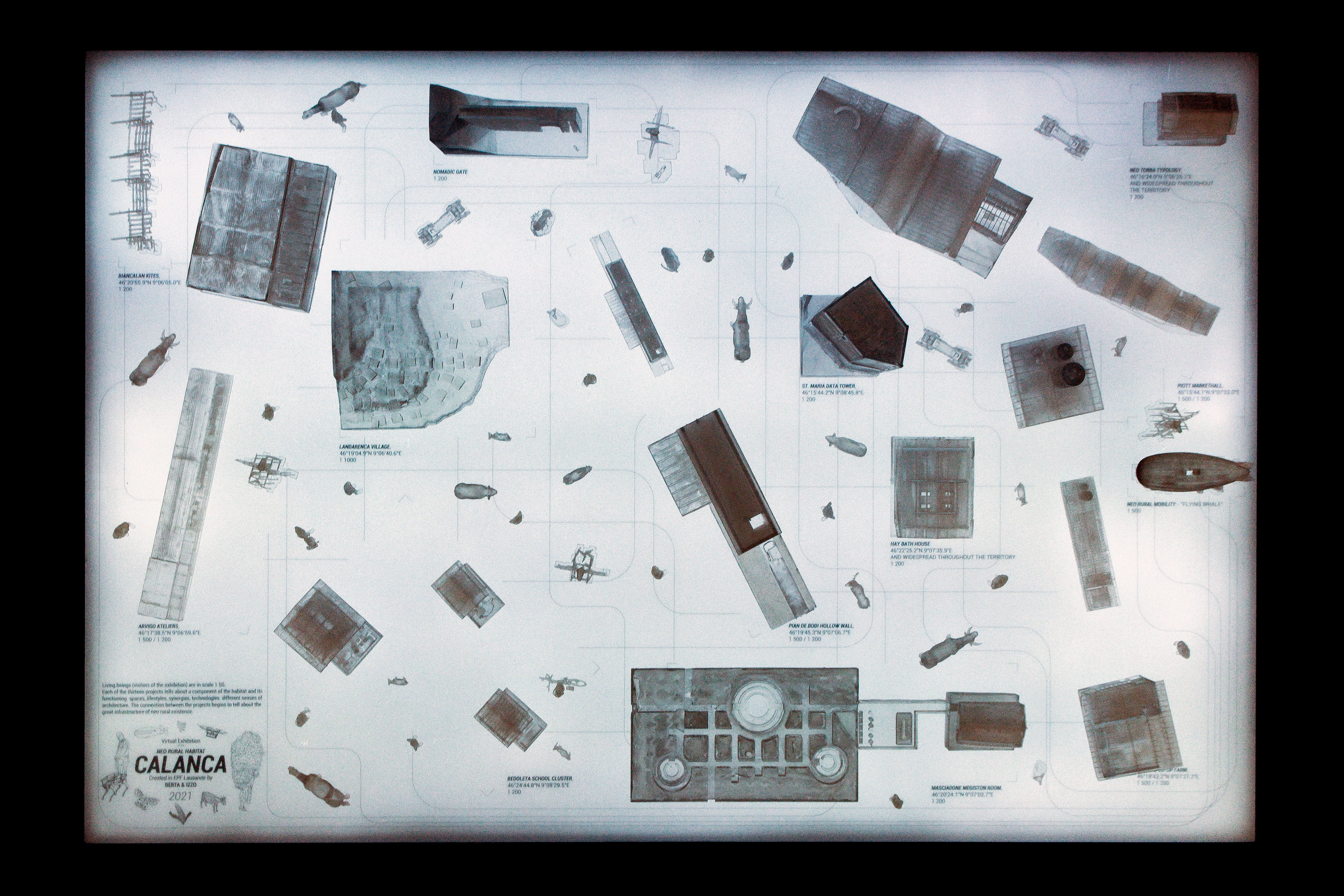 Il est peut-être redondant d’affirmer que l'urgence climatique et la transition écologique doivent être traitées comme des priorités par le monde politique. Il l'est certainement moins de rappeler que la contribution de l'architecte peut constituer un réel élan pour cette cause. Partant d'une remise en question radicale du système occidental, des composantes et du fonctionnement de la vie quotidienne et du paradigme campagne productive / ville consommatrice, ce travail « horizontal » s'engage dans la conception d'un scénario alternatif pour un possible habitat humain, où une communauté puisse à nouveau être connectée à son territoire. La dimension «néo-rurale» s'appuie sur des réflexions et théories fondamentales telles que le biorégionalisme et sur des travaux récents traitant du thème de la campagne(1). Une attention particulière est portée sur l’utilisation de la technologie, dans divers contextes et à différentes échelles. La ville n'est pas condamnée à l'apocalypse dans le discours, mais mise de côté pour un moment afin d’étendre les imaginaires des habitats humains à l'ensemble des territoires terrestres, en se penchant justement sur le monde rural. Parmi les innombrables possibilités, la Calanca est le site désigné comme laboratoire expérimental dans lequel le récit néo-rural se situe. Ce qui rend cette vallée si attrayante (et la réflexion si intense), c’est l'état d'abandon de la région, le dépeuplement constant et le fascinant caractère sauvage de la nature, ainsi que les traces d’un passé à découvrir. (1) Spécialement ceux de S. Marot et R. Koolhaas/AMO. Voir la bibliographie de l’énoncé théorique Neo Rural Chronicles. Decolonizing Imageries of the Human Habitat.