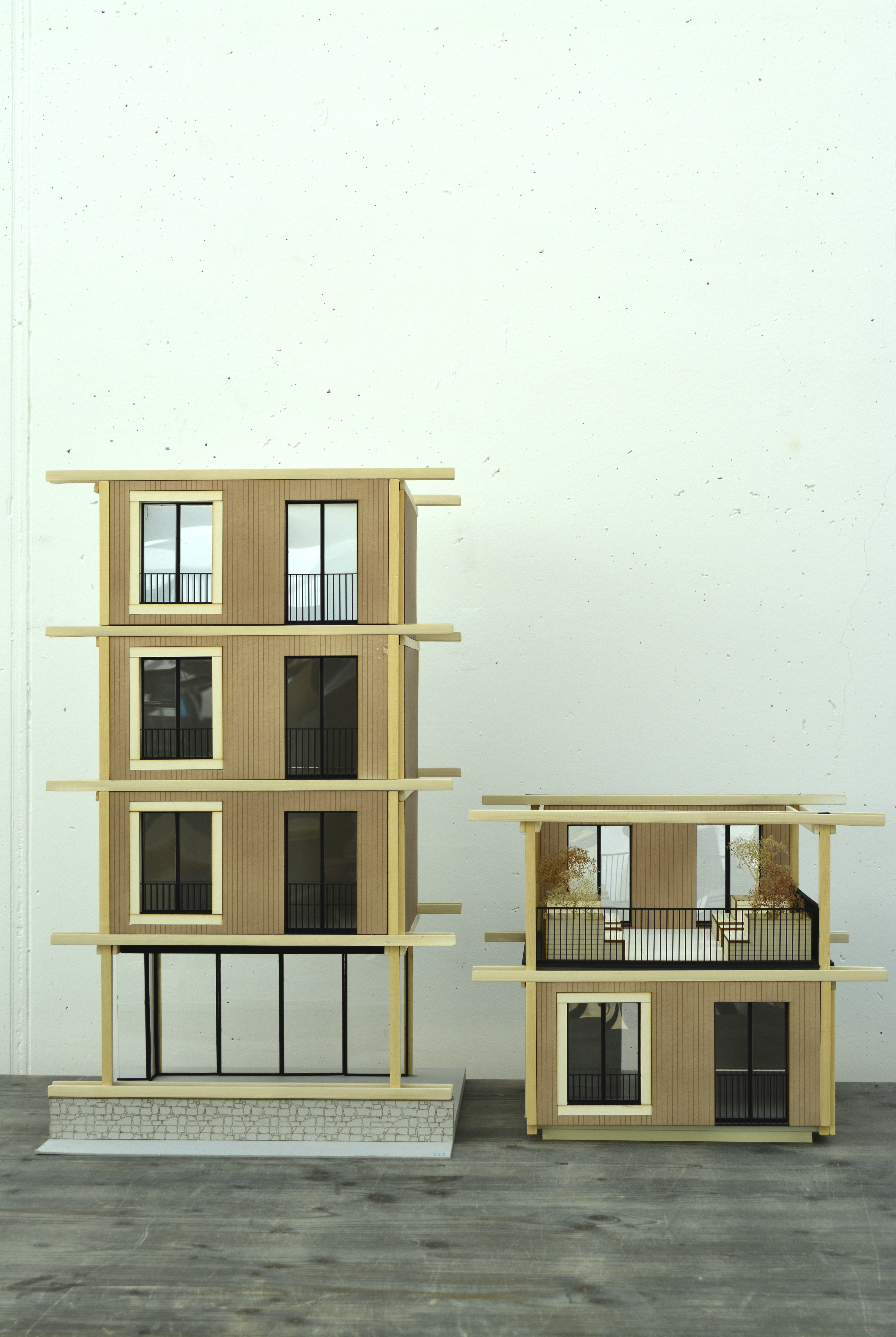La proposition prend la forme d'une méta-structure de 6 niveaux supportant le programme d'habitation ainsi qu'un espace public construit et végétalisé qui se développe verticalement à l’Est du site. A l’interface entre le tissu urbain existant et son développement en direction du Sud, le site d’implantation permet, par sa proximité aux infrastructures de transport, une réponse aux enjeux urbains et sociaux d’une ville à forte croissance comme Sion. Au rez-de-chaussée, un passage couvert joue le rôle de seuil entre des locaux d’activité et l’avenue de Tourbillon, artère passante de la ville. Dans une gradation du public vers le privé, les circulations verticales généreuses favorisent, au sein du volume bâti, les interactions sociales entre les résidents et aboutissent à l'étage de couronnement dédié aux activités collectives. Destinés à des personnes recherchant un mode d’habiter qui s’éloigne du cadre de la famille traditionnelle, les appartements prennent la forme de grandes co-habitations agencées de façon à garantir l'équilibre entre intimité et vie collective. Le module de 5.60 x 5.60 m sert de base pour la composition. Il contient la suite privatisée qui peut varier selon la structure des ménages et qui assure l’intimité nécessaire au sein des appartements. Dans son aspect constructif, la structure se compose d’un réseau d’assemblages moisés de montants verticaux en bois de chêne et de poutres métalliques traversantes dans le sens horizontal. Des panneaux et dalles à ossature bois préfabriqués assurent les remplissages et les cloisonnements. Hors de l’enveloppe, la matrice prend la fonction de pergola végétalisée qui cadre les espaces extérieurs de chaque appartement en offrant ombrage et intimité aux occupants.