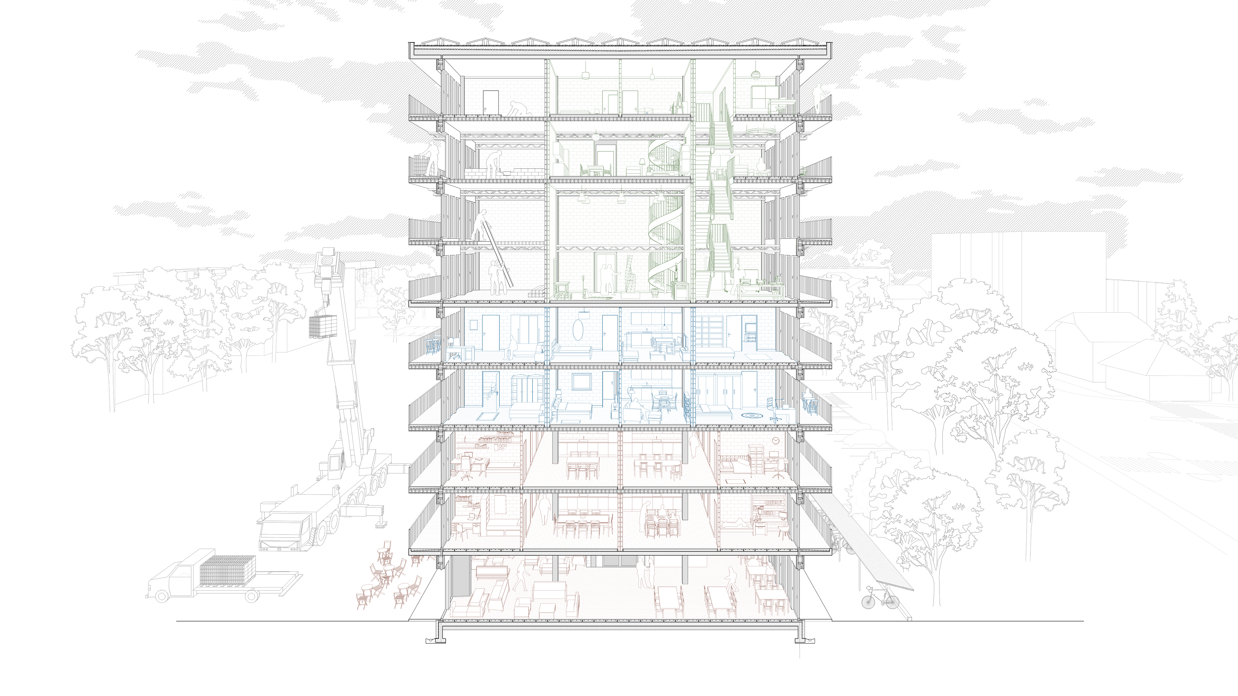 Face aux enjeux environnementaux, il devient urgent de changer les habitudes du secteur de la construction afin de la rendre plus durable. Le gaspillage des matières premières, la production massive de déchets, la consommation excessive d’énergie sont des phénomènes qui peuvent être freinés par le passage à une économie circulaire pour laquelle la construction réversible et le réemploi sont des pistes prometteuses. En anticipant l’évolution d’un bâtiment, la construction réversible permet de repousser son obsolescence en diminuant au maximum les adaptations et leurs coûts lors d’une future transformation. Partant du constat que la construction en milieu urbain passe dorénavant majoritairement par un travail avec l'existant, ce projet de master applique la construction réversible à une extension d’une barre de logement située à Chêne-Bourg, dans la périphérie de Genève. L’évolution du bâtiment se fait au travers de trois scénarios, chacun amenant un nouveau programme. Il ne s’agit-là que de trois possibilités parmi d’autres, l’utilisation future du bâtiment étant impossible à prédire. Tout l’enjeu de cette recherche consiste plutôt à mettre en place une nouvelle méthode de projet permettant de concevoir un bâtiment facilement adaptable à de nouveaux usages, de tirer parti de son contexte et d’avoir le moins d'impact possible sur l’environnement.