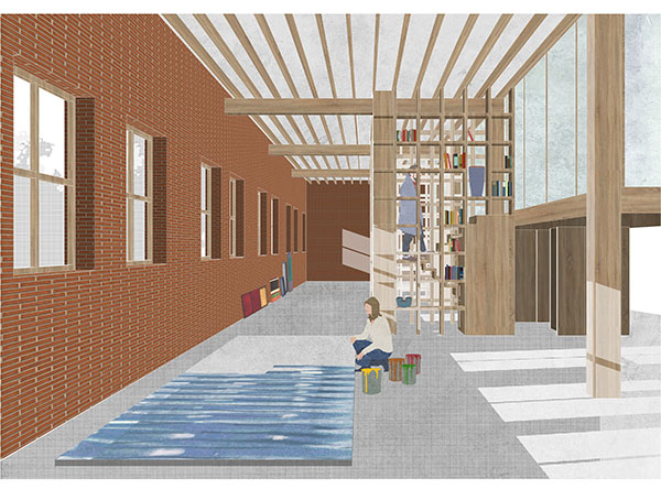 L'Amérique est un pays qui se sillonne parce qu'il est vaste et ses paysages infinis. Porté par le goût de la liberté, l'esprit du motel se répand. Mais le mythe est noir. Le “River North Art District Motel” est d'un nouveau type, entre rétro et futurisme. A l'entrée du centre ville de Denver, il s'allie avec un ancien entrepôt en brique, transformé en atelier artistique. Ce motel-ci n'est plus totalement capitaliste. Les deux programmes, hébergement et ateliers, marchent en symbiose. L'un fait fonctionner l'autre. Tous deux participent à la vie du quartier, mélangent les populations, transmettent et échangent les idées, celles du voyage avec celles de l'art. Ils réunissent les logés, les visiteurs, les artistes permanents et itinérants. Imperceptible depuis la rue, la coursive ellipsoïdale rassemble de façon simple les deux activités. D'un côté, elle tourne autour du ballet des arrivées et venues des voyageurs, et donne, de l'autre côté, sur les ateliers et un grand hall d'exposition. Les globe-trotters curieux iraient sans encombre observer les artistes travailler et les rencontrer sur la coursive autour d'un verre, tandis que certains créateurs, venus de Chicago ou de San Francisco pour quelques semaines, profiteraient des chambres d'en face.