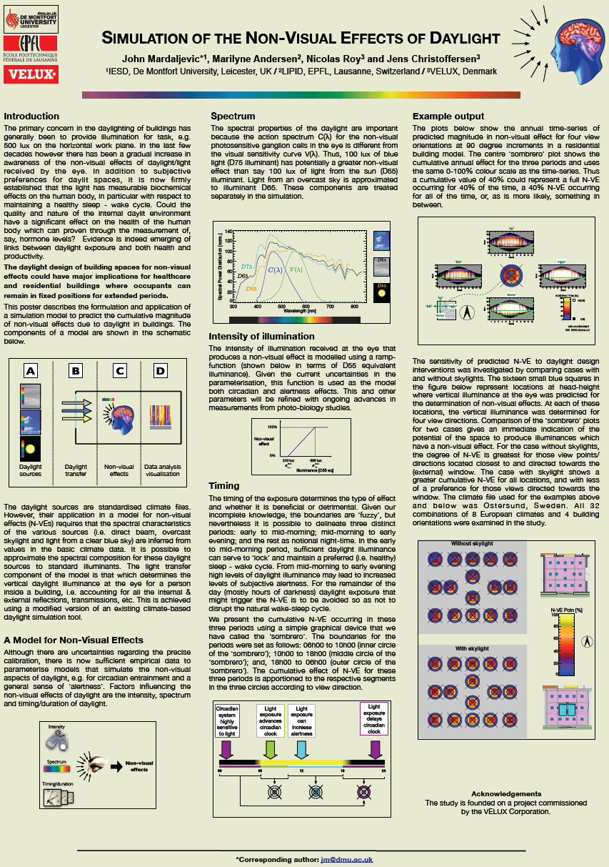 The daylight design of building spaces for non-visual effects could have major implications for healthcare and residential buildings where occupants can remain in fixed positions for extended periods. This poster describes the formulation and application of a simulation model to predict the cumulative magnitude of non-visual effects due to daylight in buildings.