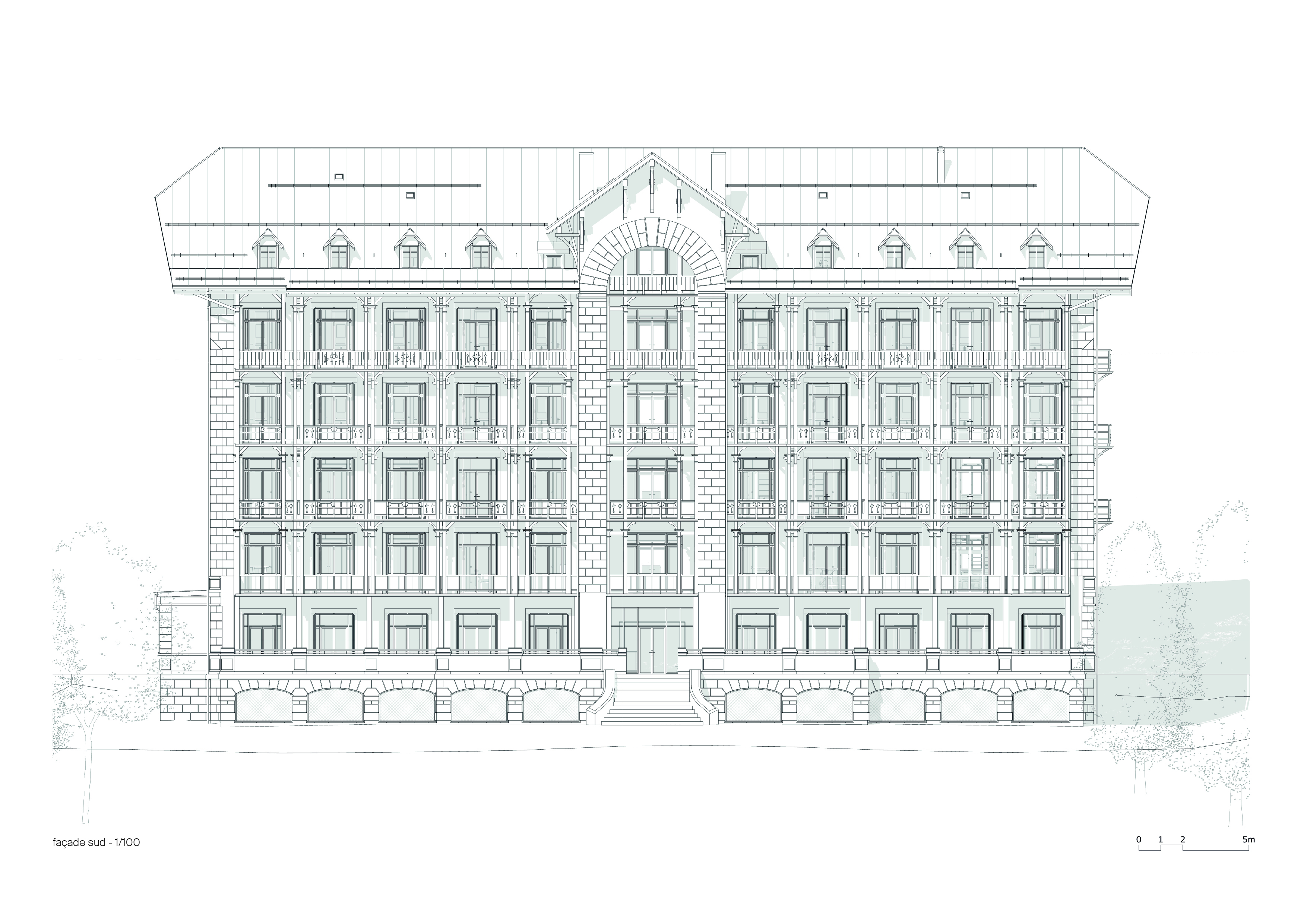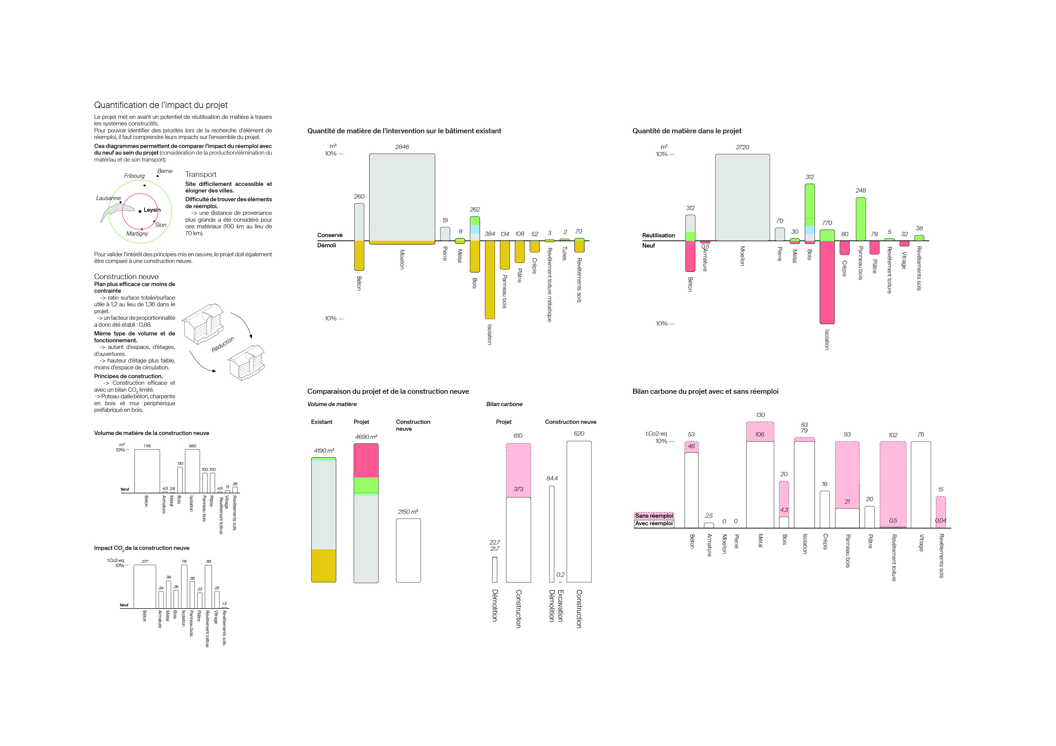Dans un contexte où la nécessité de changer les méthodes de construction devient un réel enjeu, la remise en circulation de matériaux dans de nouveaux projets apparaît comme une solution. Elle est de plus en plus mise en avant et sollicitée par certains acteurs de la construction pour répondre aux problématiques de raréfaction des ressources et de production de déchets et de CO2. Avec la démocratisation des processus BIM, il a été question, dans un premier temps, de savoir si ceux-ci peuvent être des outils répondant aux freins multiples que connaît le réemploi. Pour intégrer des principes de réutilisation, ce projet se base sur la valorisation du bâti existant, avec comme cas d’étude l’ancien hôtel des Chamois à Leysin (VD). Le maintien de certaines parties du bâtiment permet de préserver son caractère patrimonial tout en l’utilisant comme première source de matière. La distinction des relations et jonctions entre les différents systèmes constructifs, existants et nouveaux, amène à une réversibilité des matériaux et des espaces. La réhabilitation de cet hôtel a pour but de sauvegarder et réaffirmer un bâtiment emblématique du paysage leysandois en surplomb du village. L’adaptation du programme en un lieu de retraite studieuse, permettant d’offrir des espaces de travail pour quelques jours, inscrit le bâtiment dans la dynamique de développement sur quatre saisons de la commune de Leysin.