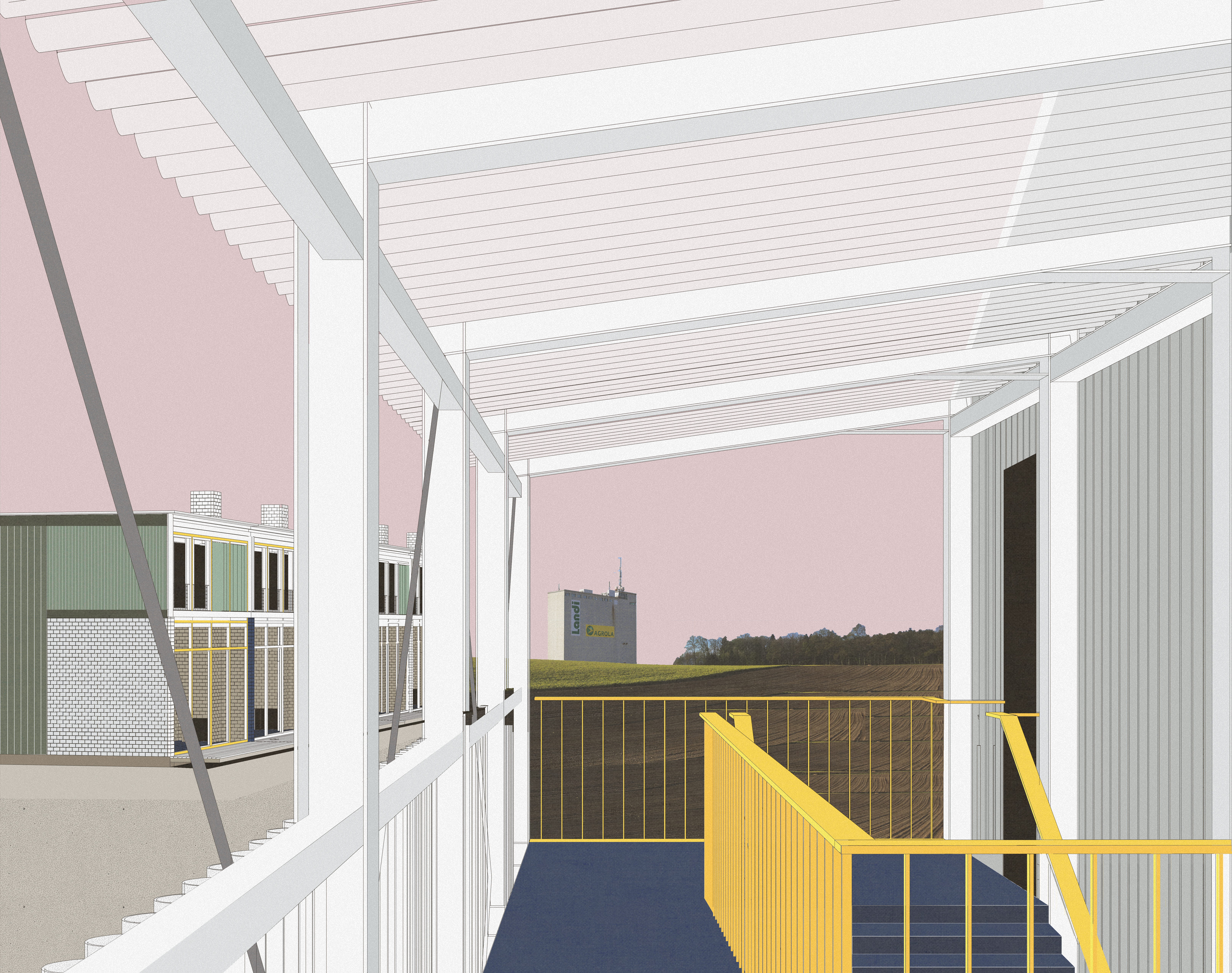 Le projet vise à démontrer la faisabilité mais aussi les avantages d’habiter un quartier mixte. En effet, la cohabitation entre une trentaine de logements coopératifs et une activité industrielle travaillant le bois permet aÌ la fois d’enrichir les conditions de travail des employés, grâce à un cadre rural exceptionnel, mais aussi d’améliorer le quotidien des habitants avec la mise en place de programmes collectifs. Une cantine et une structure d’accueil pour les enfants, réunies au sein d’un même bâtiment, permettent de rassembler les acteurs de cette communauté, d’encourager les échanges intergénérationnels et le partage des infrastructures. Si l’industrie assure une constante animation au cœur du quartier d’habitation, sa nature participe également à l’identité du quartier. Par ailleurs, l’implantation de nombreux espaces verts, de jardins collectifs ainsi qu’un accès direct à la terre depuis chaque logement mettent en exergue les qualités de vie qu’offre la campagne. L’implantation dans le village de Fey promet un cadre idyllique pour toute entreprise soucieuse du bien-être et des conditions de travail de ses employés. Le calme et la sérénité qui émanent de la proximité avec la nature permettent de se ressourcer. Une telle disposition mixte peut être perçue comme un prototype capable de s’adapter à différents environnements et différentes activités industrielles. Pour cette raison, l’implantation d’une industrie travaillant le bois pourrait aussi bien se faire à Sugnens qu’à Echallens, du moins dans le contexte du LEB. Finalement, cette flexibilité inscrit le projet dans une démarche de réindustrialisation des villes qui cherche, avant tout, à lutter contre le zonage devenu systématique.