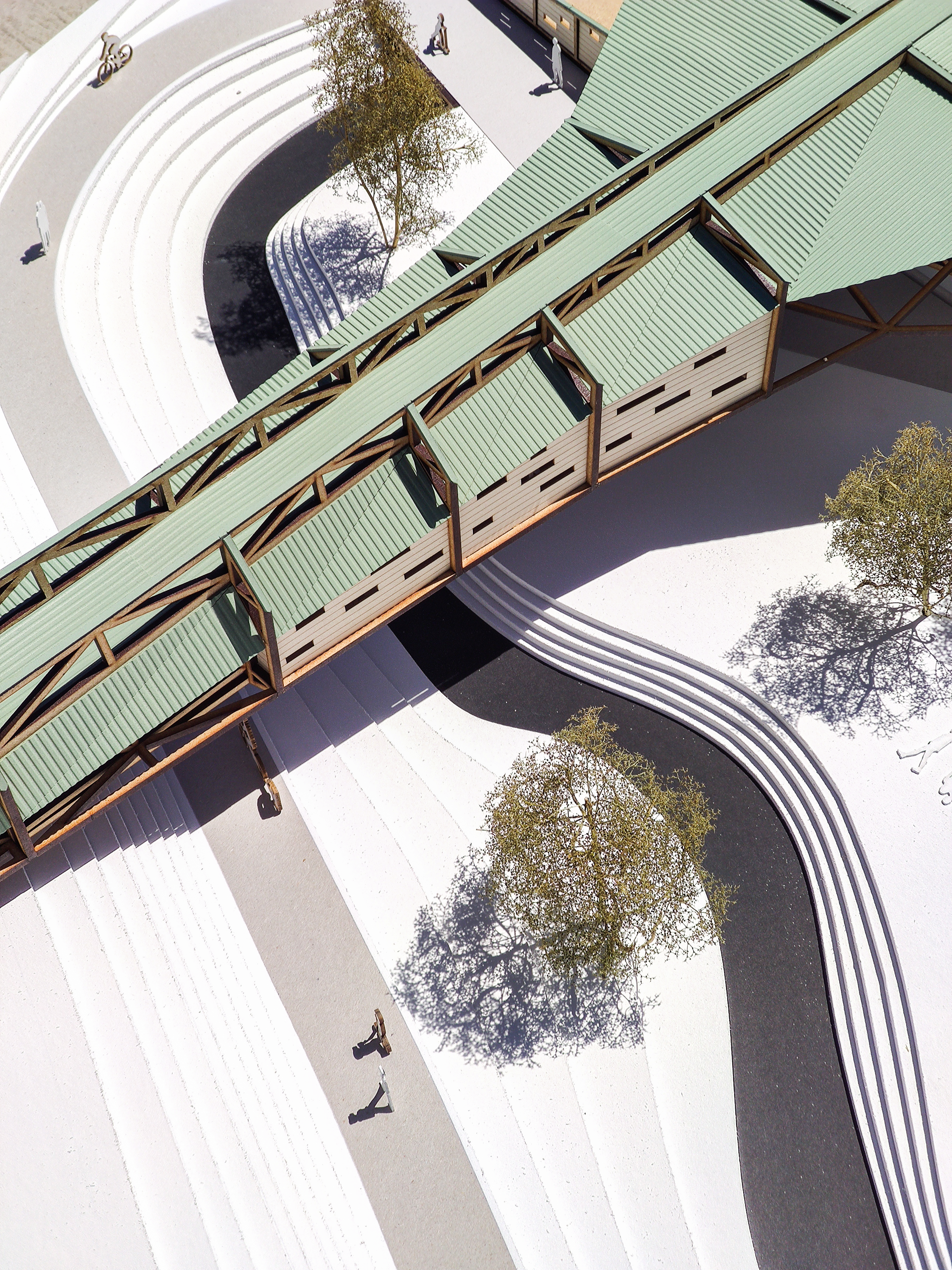 La localisation de l’édicule recensé n˚16312 et la qualité de son environnement sont propices à l’installation d’un observatoire ornithologique axé sur la nouvelle île aux oiseaux Leusonna que le Cercle Ornithologique de Lausanne projette de construire à l’embouchure de la Chamberonne. Mon projet de master propose une surélévation de cet édicule, précédée d’une modification du site. Au redessin de la promenade et au creusement d’une tranchée qui isole le site pour en faire une réserve favorable à l’avifaune, s’ajoute la surélévation destinée à accueillir l’observatoire. Les fondations en béton existantes sont renforcées et la charpente de l’édicule est repensée : du plan octogonal de 346 m² niché à +4.70 m qui en résulte, se déploie géométriquement une rampe – longue de 45 m à pente régulière de 6 % PMR – qui va prendre appui sur un monticule (+2.30 m) à l’Ouest. L’observatoire pénètre la réserve de façon aérienne sans toucher son sol protégé. Il offre à la fois des points de vue optimaux en hauteur (à la manière de meurtrières) pour l’observation des espèces faisant escale sur l’île Leusonna, et au sol avec son dispositif de palissades qui ceinture l’édicule et permet le maintien des activités de son programme (locaux pour les jardiniers du parc et WC publics).