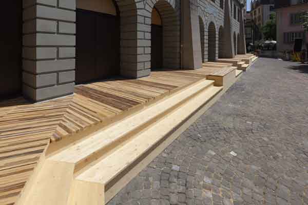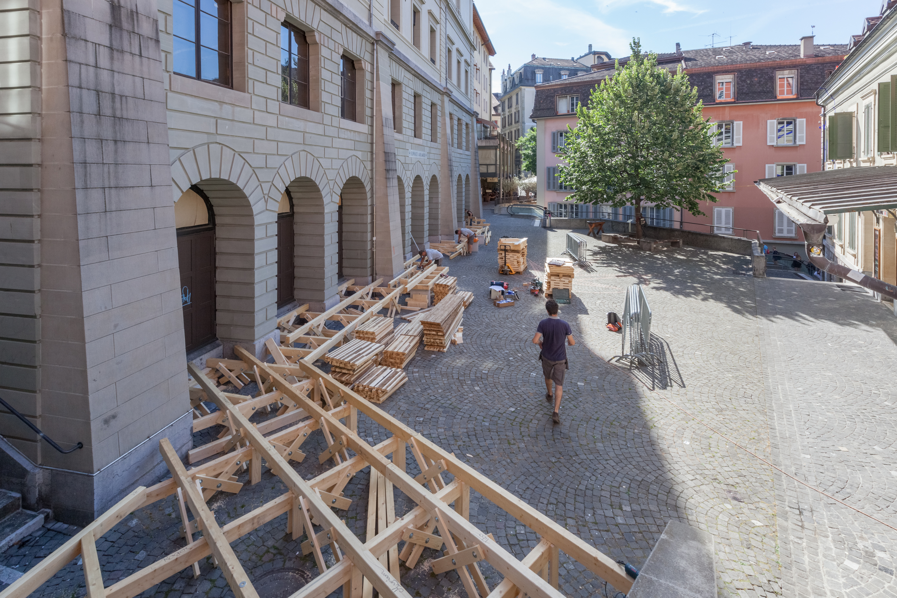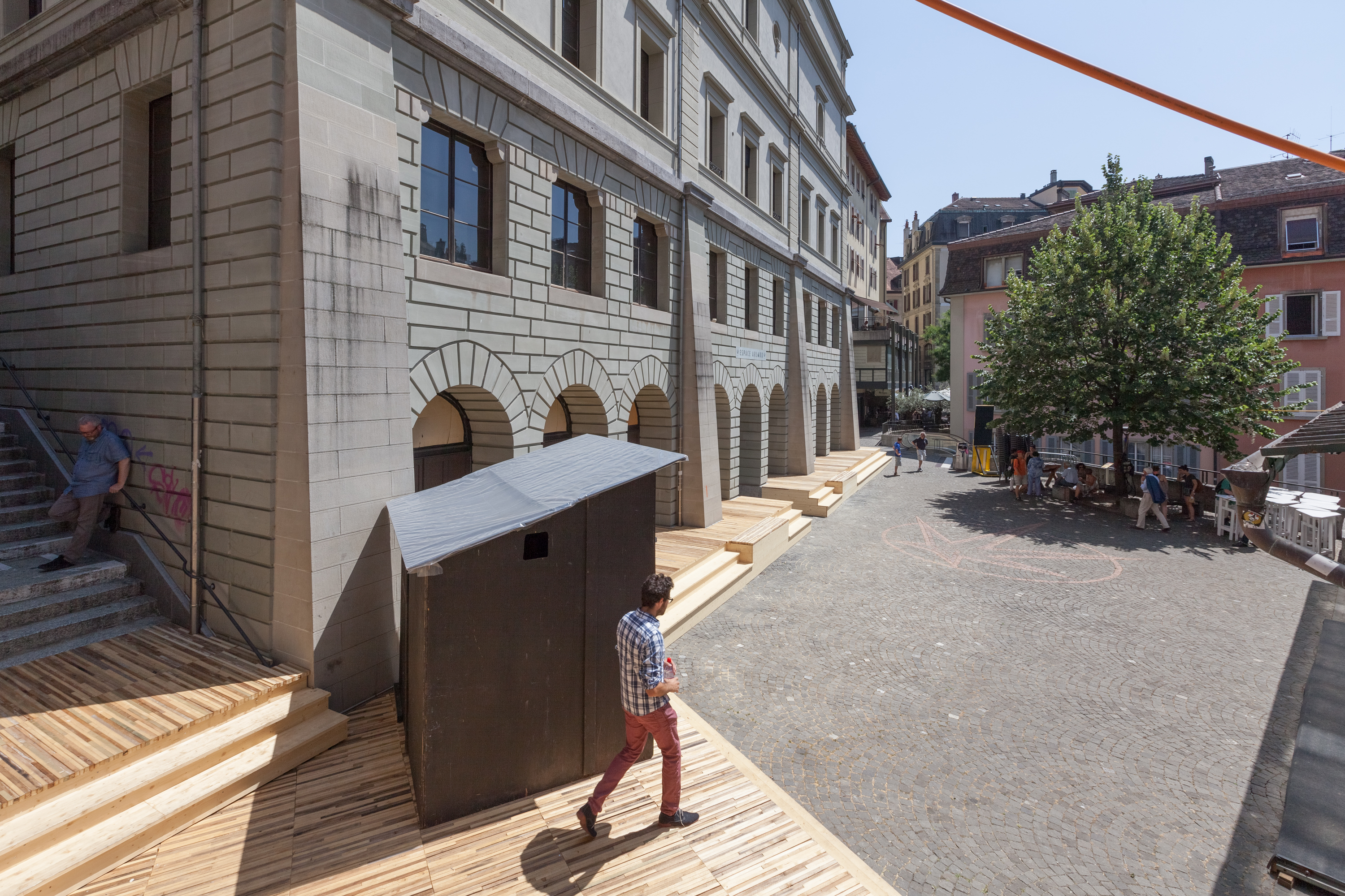 Les petits riens ; «Les balades spontanées génèrent une rupture avec un quotidien souvent routinier. Elles rendent plus charmants nos déplacements en ville, souvent dépoétisés par leur plate fonctionnalité. Rien de mieux en effet que de rentrer à pied chez soi par le chemin des écoliers, en oubliant sa montre après une journée harassante de boulot ou même de faire l'école buissonnière de temps à autre pour se rappeler qu'improviser rime bien avec liberté. Dans une ville aux mille recoins comme Lausanne, de telles pratiques sont vraiment possibles. De la sorte, on arrive souvent à saisir les différentes nuances et facettes de la ville. Un espace qui nous surprend tout à coup par son étonnante diversité.» ; [Corajoud, Pierre, Lausanne en méandres, 2003.] ; ; C'est à partir de cette trace écrite que s'est développée une idée d'intervention destinée à varier le chemin quotidien des passants. 22 petits riens furent trouvés rien que dans le centre de Lausanne: des places, des passages, des parcs et des résidus, autant d'espèces d'espaces n'attendant qu'une intervention pour s'éveiller. Un petit quelque chose naît alors permettant à un lieu de renouer avec la vivacité et l'effervescence de la ville. La place Arlaud n'attendait que cela depuis l'édification du métro M2. Elle fut une place, désormais réduite à un recoin, presque un cul-de-sac sur le bord d'un large axe piétonnier. Aujourd'hui, elle devient le foyer des édifices publics qui l'entourent, elle est une scène, une exposition, un lieu de détente, elle est fréquentée, elle sourit à nouveau, elle est vivante.