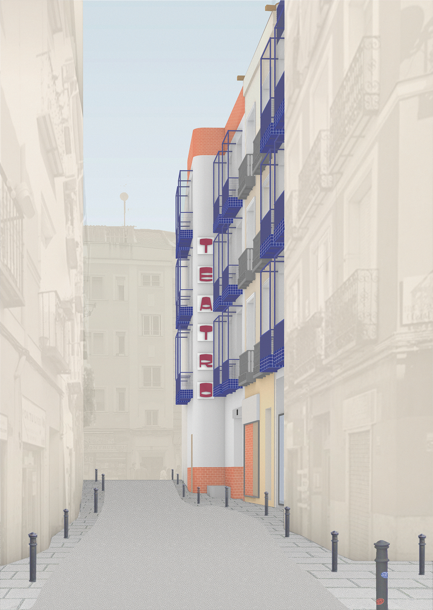 Typologie de logement social caractéristique de Madrid, les « corralas » se sont développées de manière chaotique dans le centre de la ville pour absorber l’explosion démographique entre le XVIIe et et XXe siècle. Les « cuartos », appartements d’environ 25m2 pour des familles entières, étaient organisés autour d’un patio central dans lequel, par tradition héritée des corrals de comédie du « Siglo d’Oro », des pièces de théâtre avaient lieu. La vie qui s’y déroulait était donc dramatique, tant par son insalubrité qu’au sens théâtral du terme. Au n°5 de la rue Amparo, une « corrala » construite en 1890, bordée par une parcelle vide, offre un site idéal pour optimiser ce modèle traditionnel et raviver cette activité scénique. Le projet se développe autour du patio originel: agrandi, il révèle l'intérieur du bâtiment existant et crée une place publique apte à accueillir à nouveau le théâtre et les passants curieux. Dans les étages, des appartements de formes et dimensions variées s’articulent autour d’une coursive en bois, extension du système constructif existant. Une bande de services s’y accroche pour puiser air et lumière et dessert les appartements ainsi libérés, dans lesquels les différents usagers peuvent créer leur propre décor. Familles, écrivain solitaire, troupe de comédiens, ou squatteurs « okupa »; le projet accueille une multiplicité de récits et cristallise la tension entre préservation du patrimoine architectural et adaptation à la diversité socioculturelle du quartier de Lavapiés.